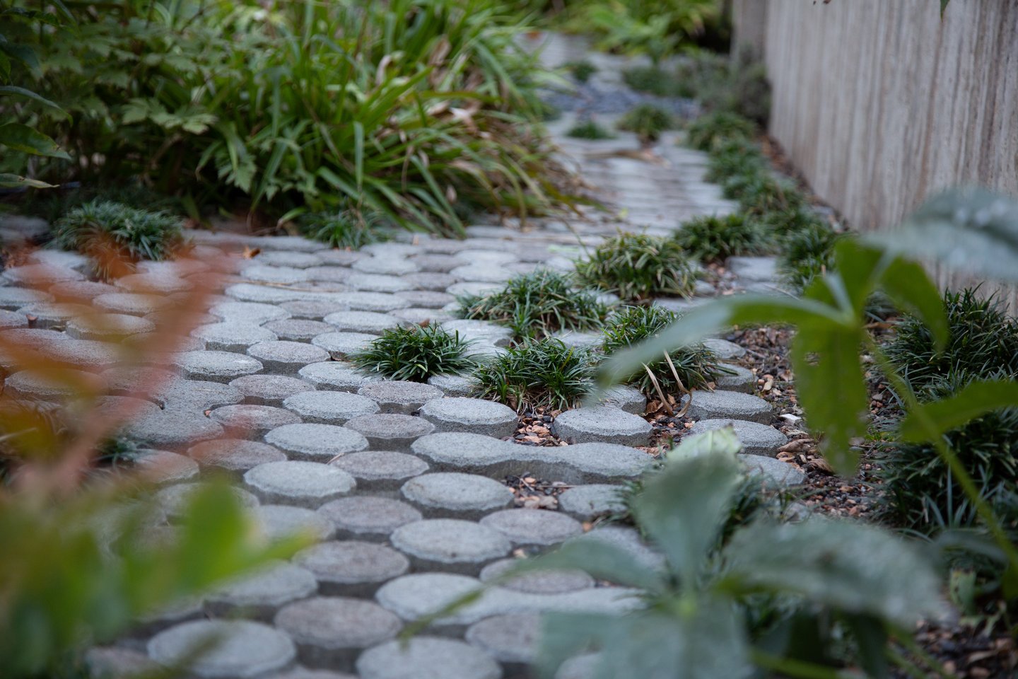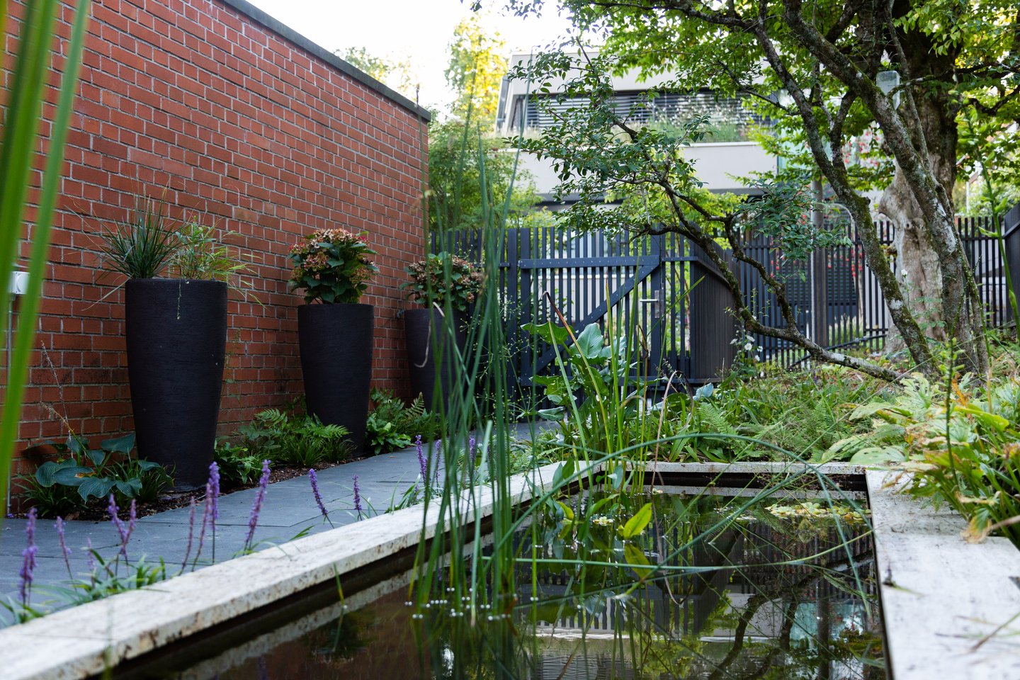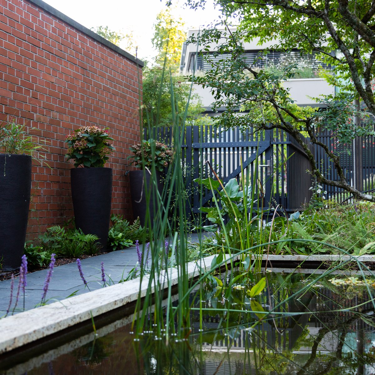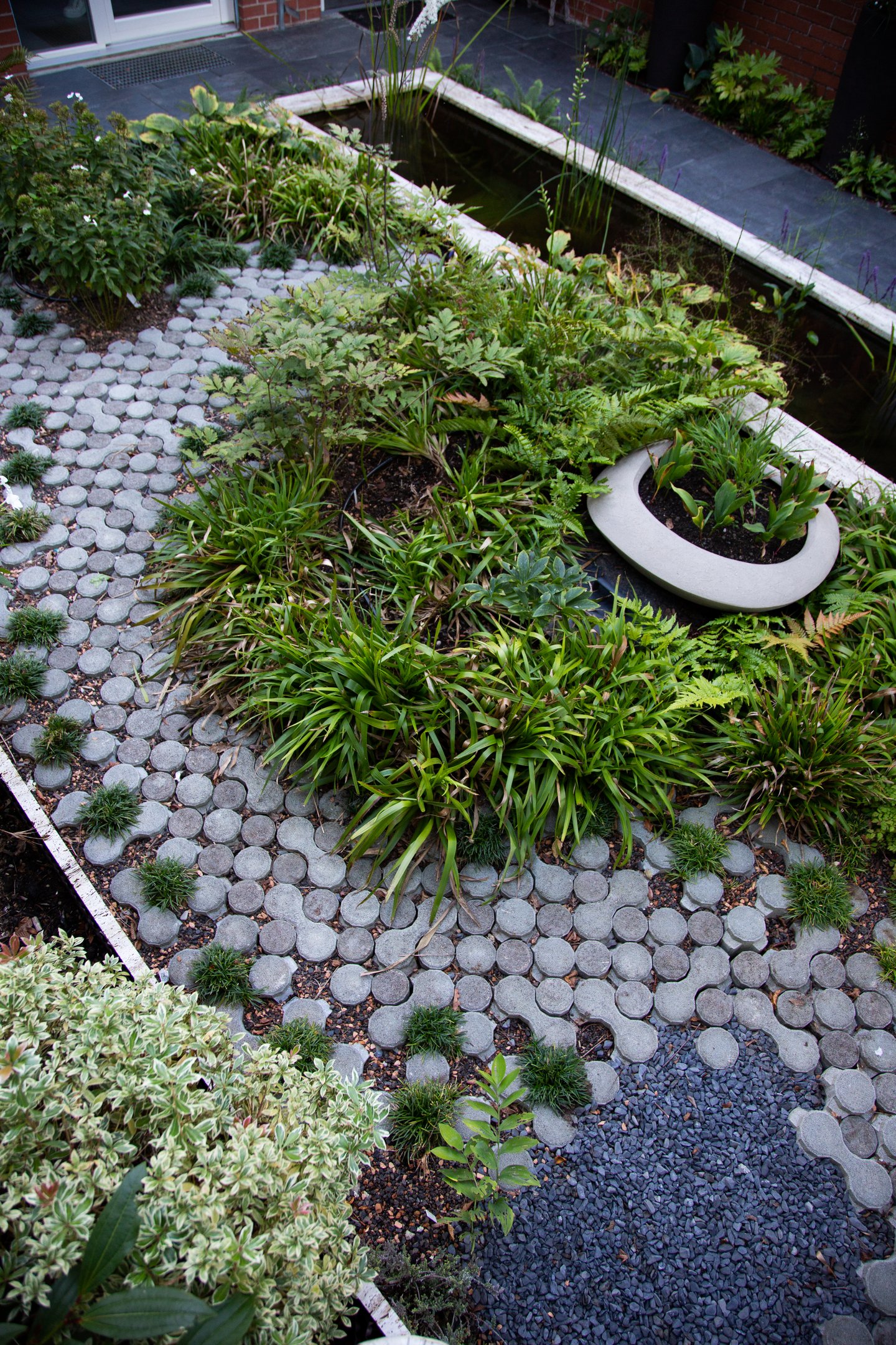 Ein bepflanztes Wasserbecken begleitet den Besucher auf dem Weg zum Hauseingang. Entdecken lassen sich die Bereiche durch einen geschwungenen «Punkteweg», der durch die abwechslungsreiche Bepflanzung führt.