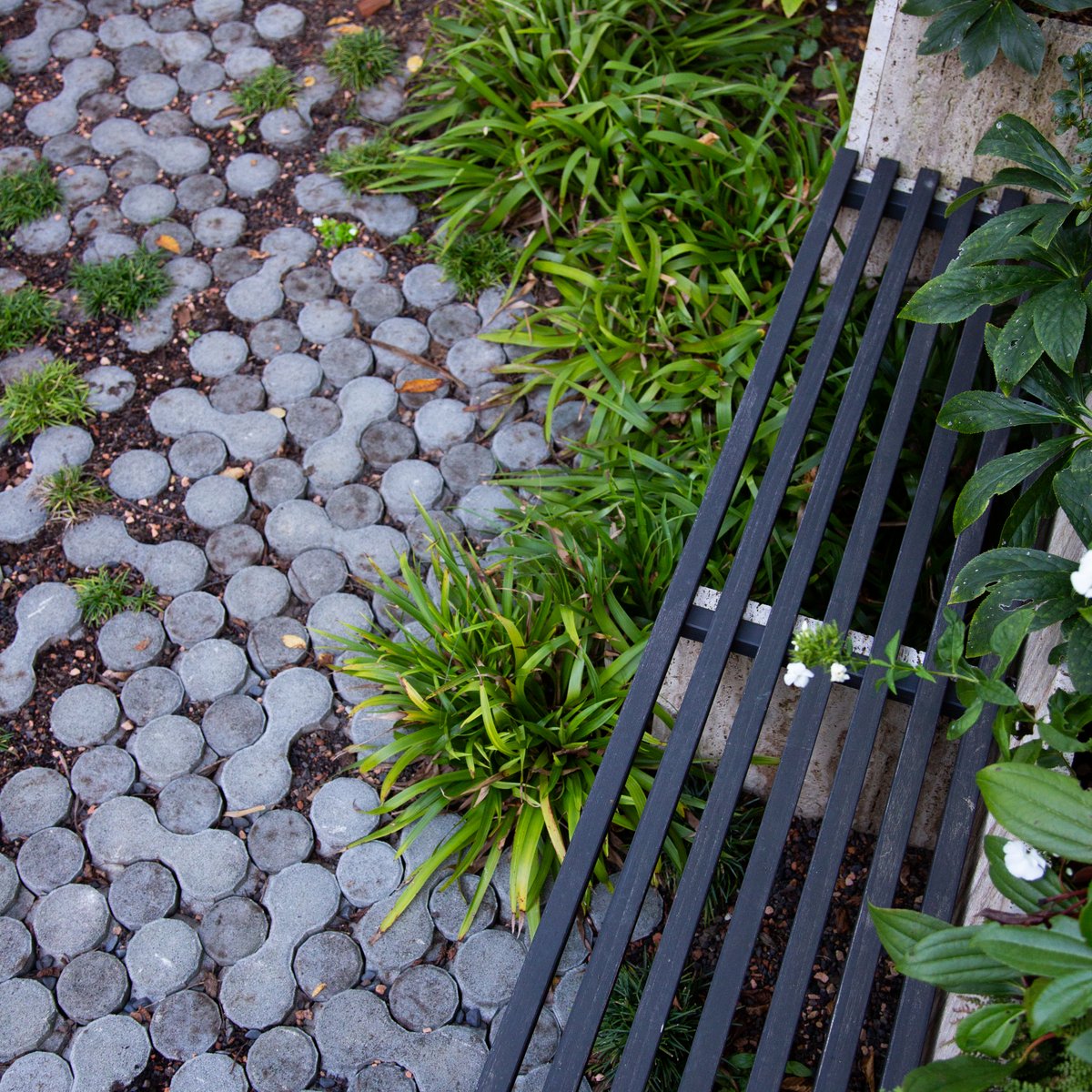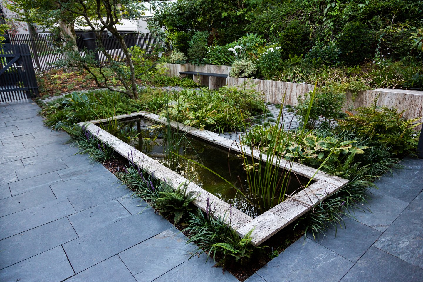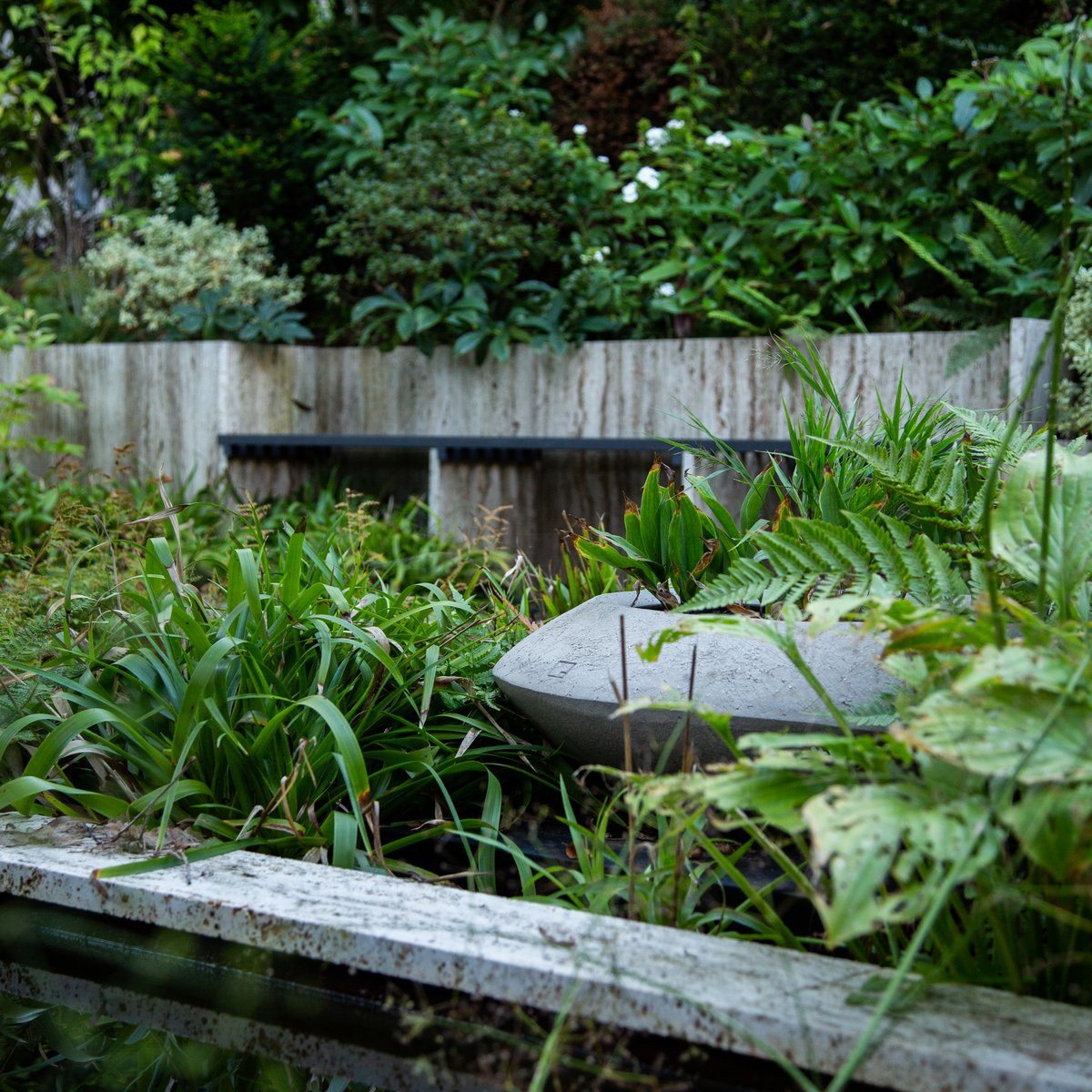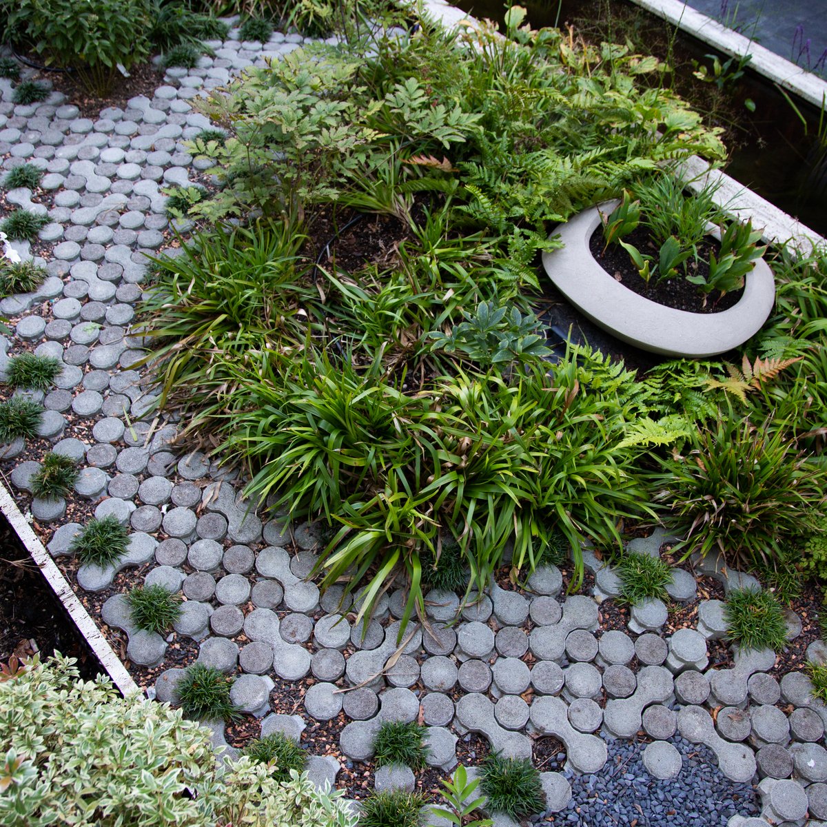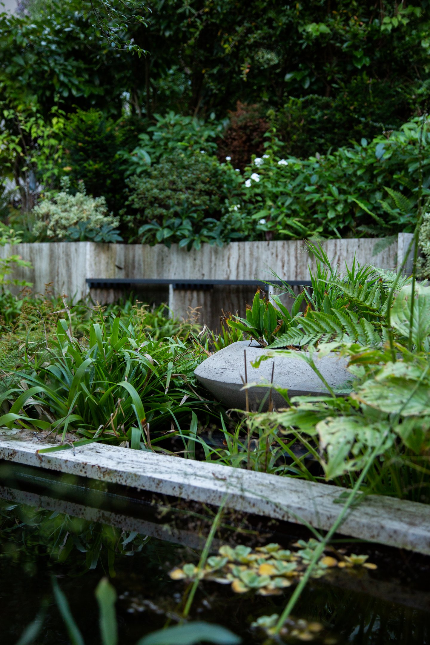 Ein bepflanztes Wasserbecken begleitet den Besucher auf dem Weg zum Hauseingang. Entdecken lassen sich die Bereiche durch einen geschwungenen «Punkteweg», der durch die abwechslungsreiche Bepflanzung führt.