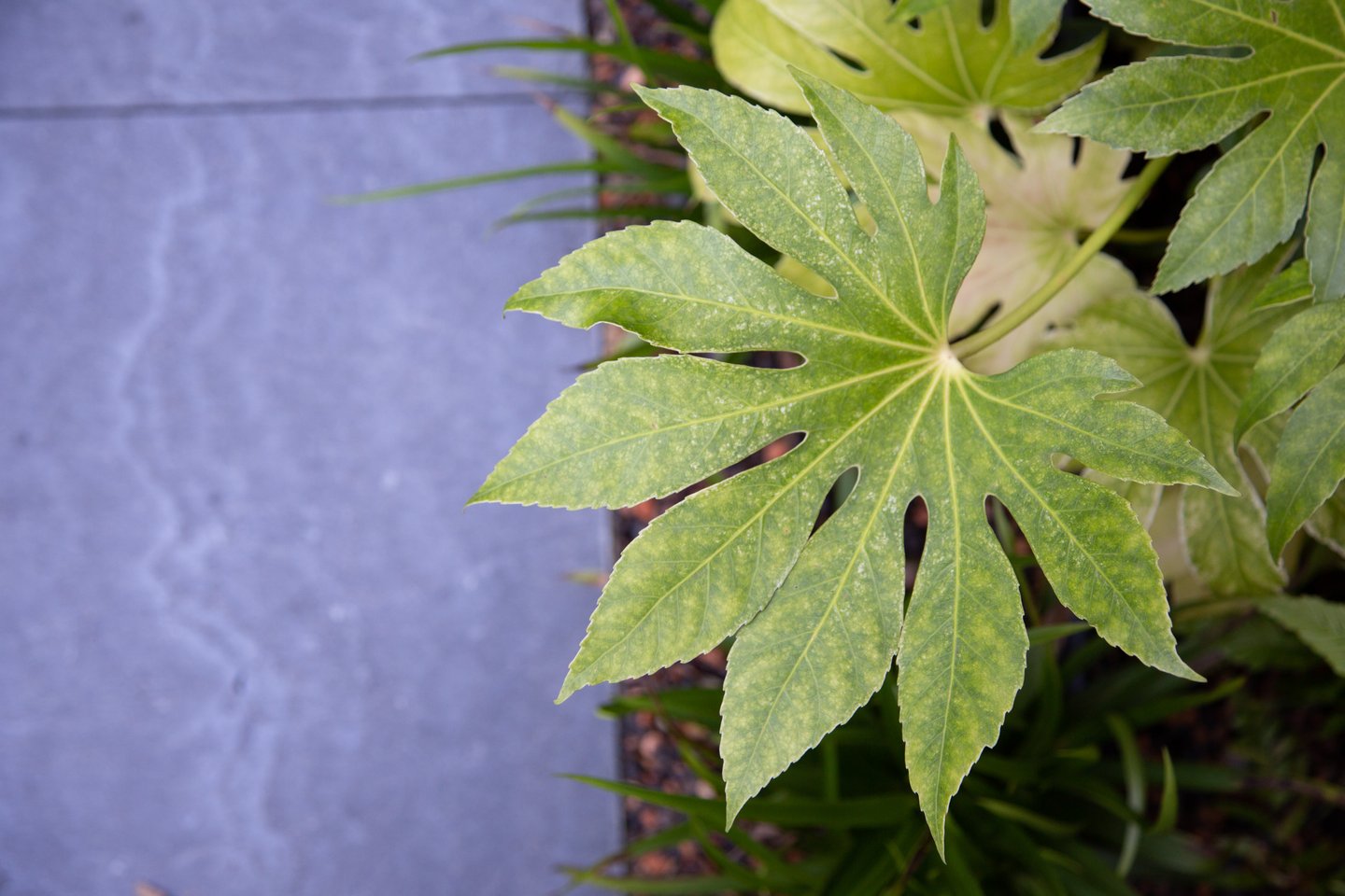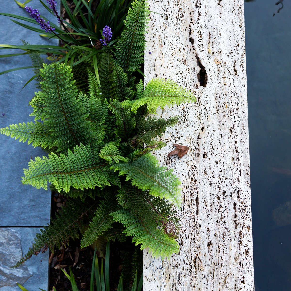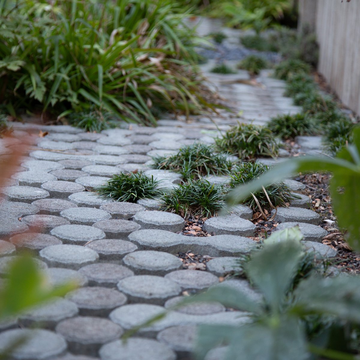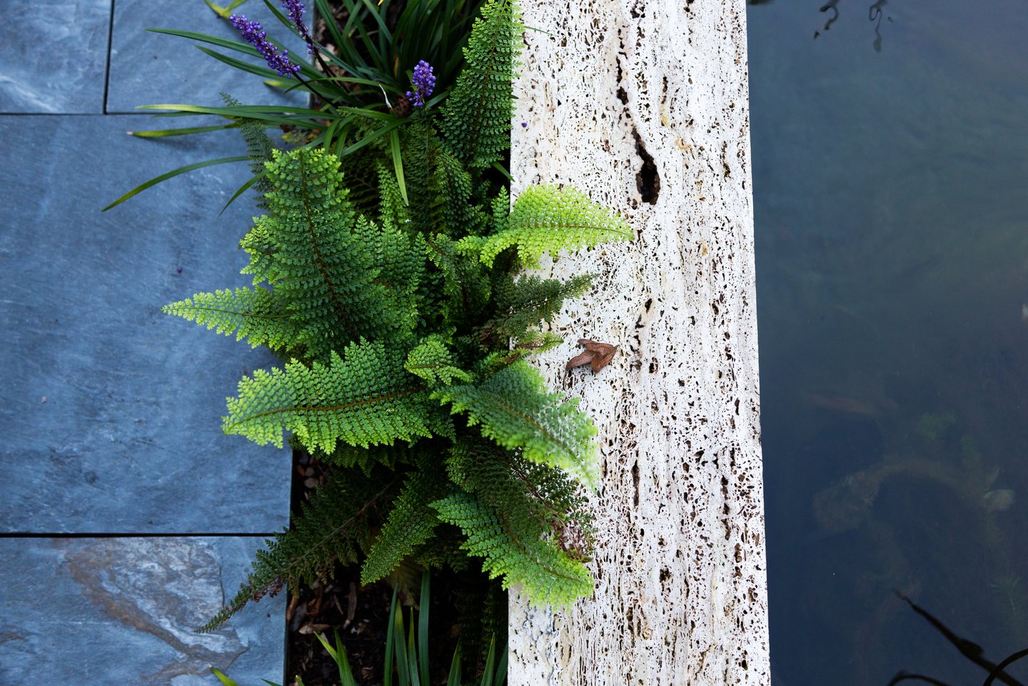 Ein bepflanztes Wasserbecken begleitet den Besucher auf dem Weg zum Hauseingang. Entdecken lassen sich die Bereiche durch einen geschwungenen «Punkteweg», der durch die abwechslungsreiche Bepflanzung führt.