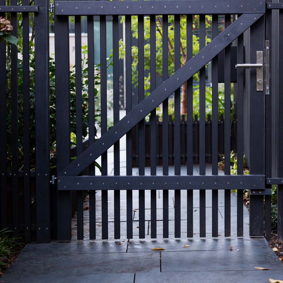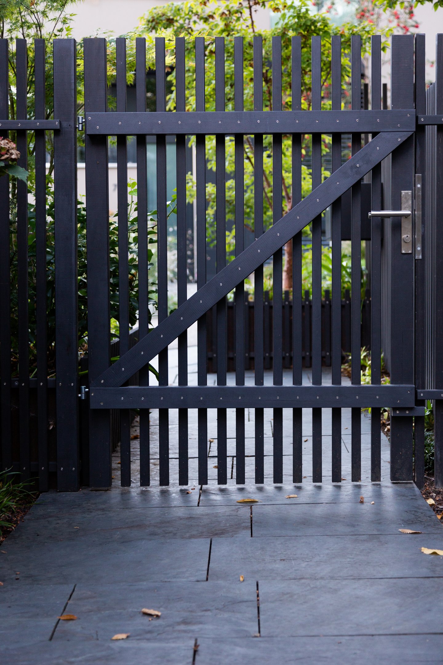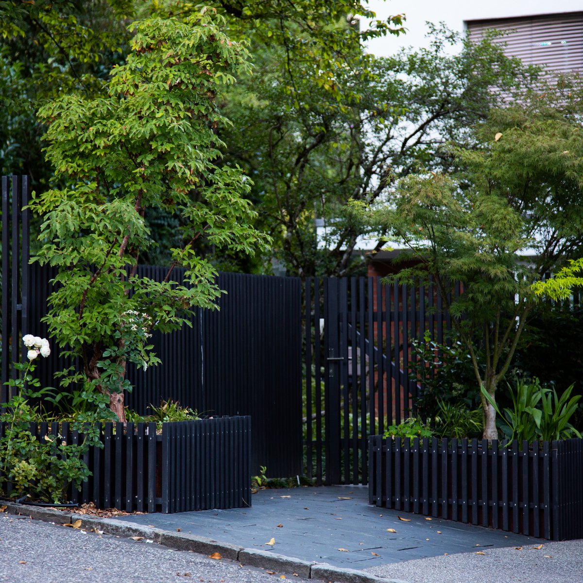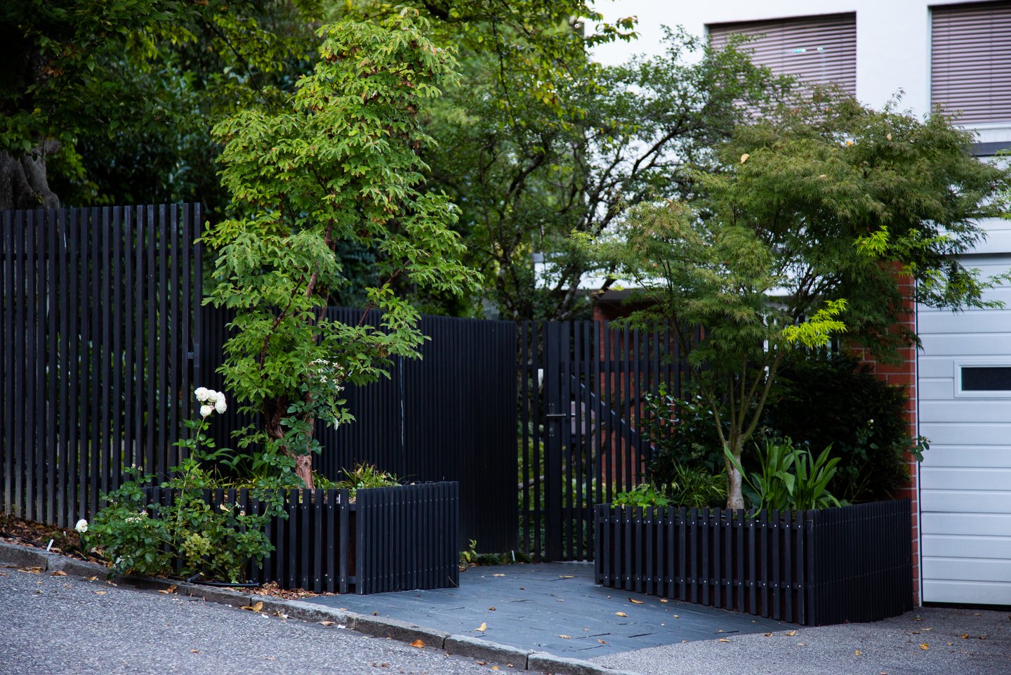Zaun und Gartentüre aus schwarzen Holzlatten geben einen diffusen Sichtschutz und stehen im Kontrast zu dem Grün der Pflanzen und den weissen Blüten.