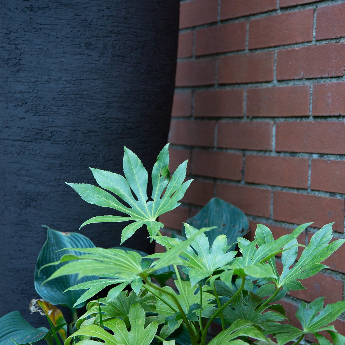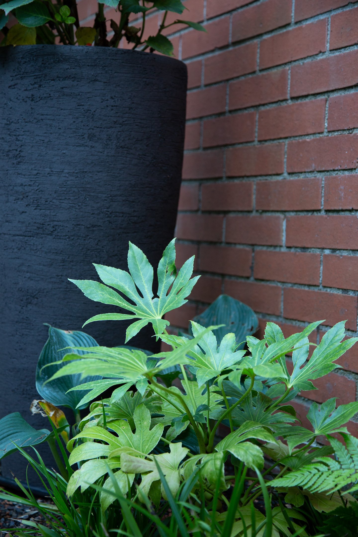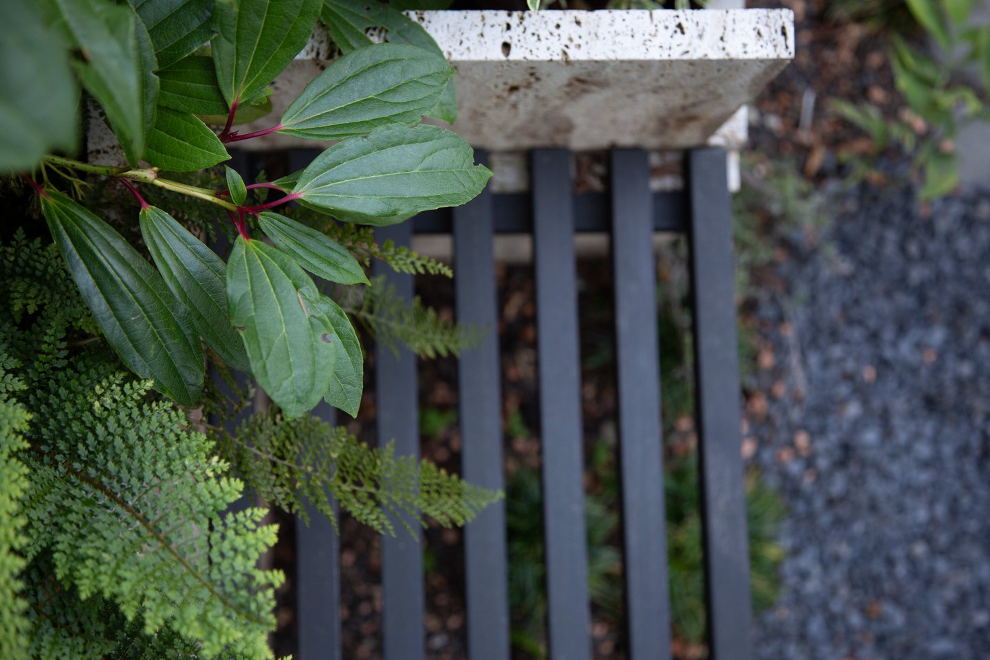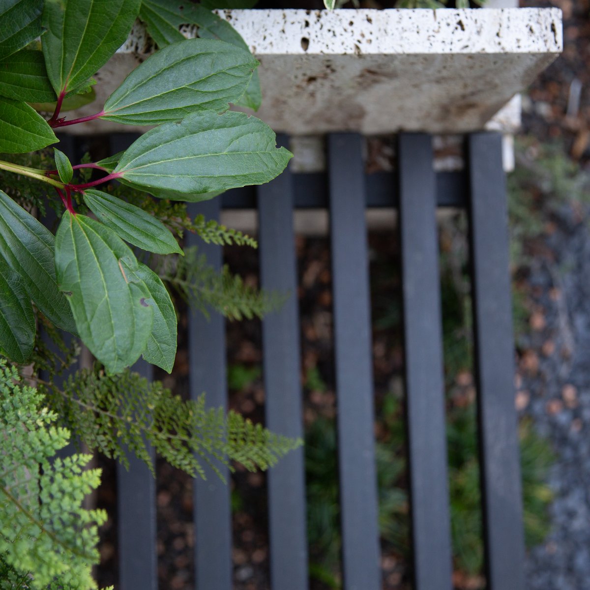 Zaun und Gartentüre aus schwarzen Holzlatten geben einen diffusen Sichtschutz und stehen im Kontrast zu dem Grün der Pflanzen und den weissen Blüten.