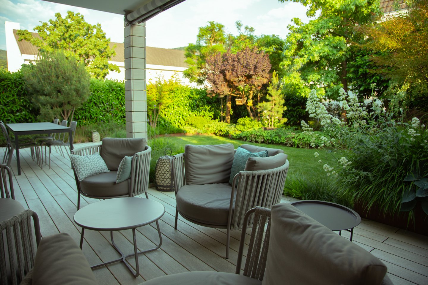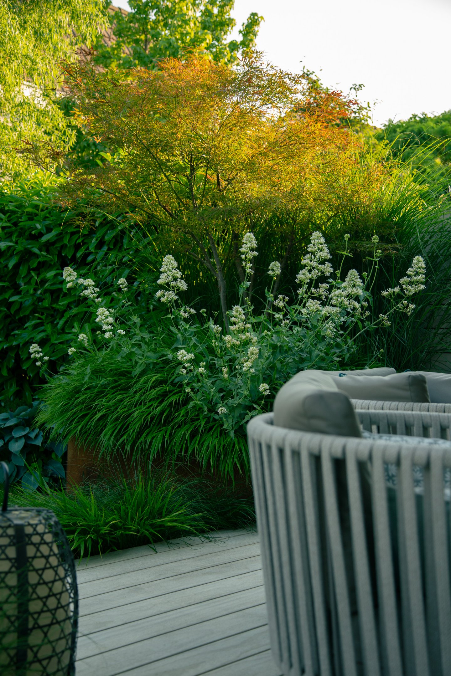 Der Reihenhausgarten präsentiert sich somit als einladender Raum für Entspannung, Geselligkeit und Naturgenuss, der modernes Design mit natürlicher Schönheit vereint.