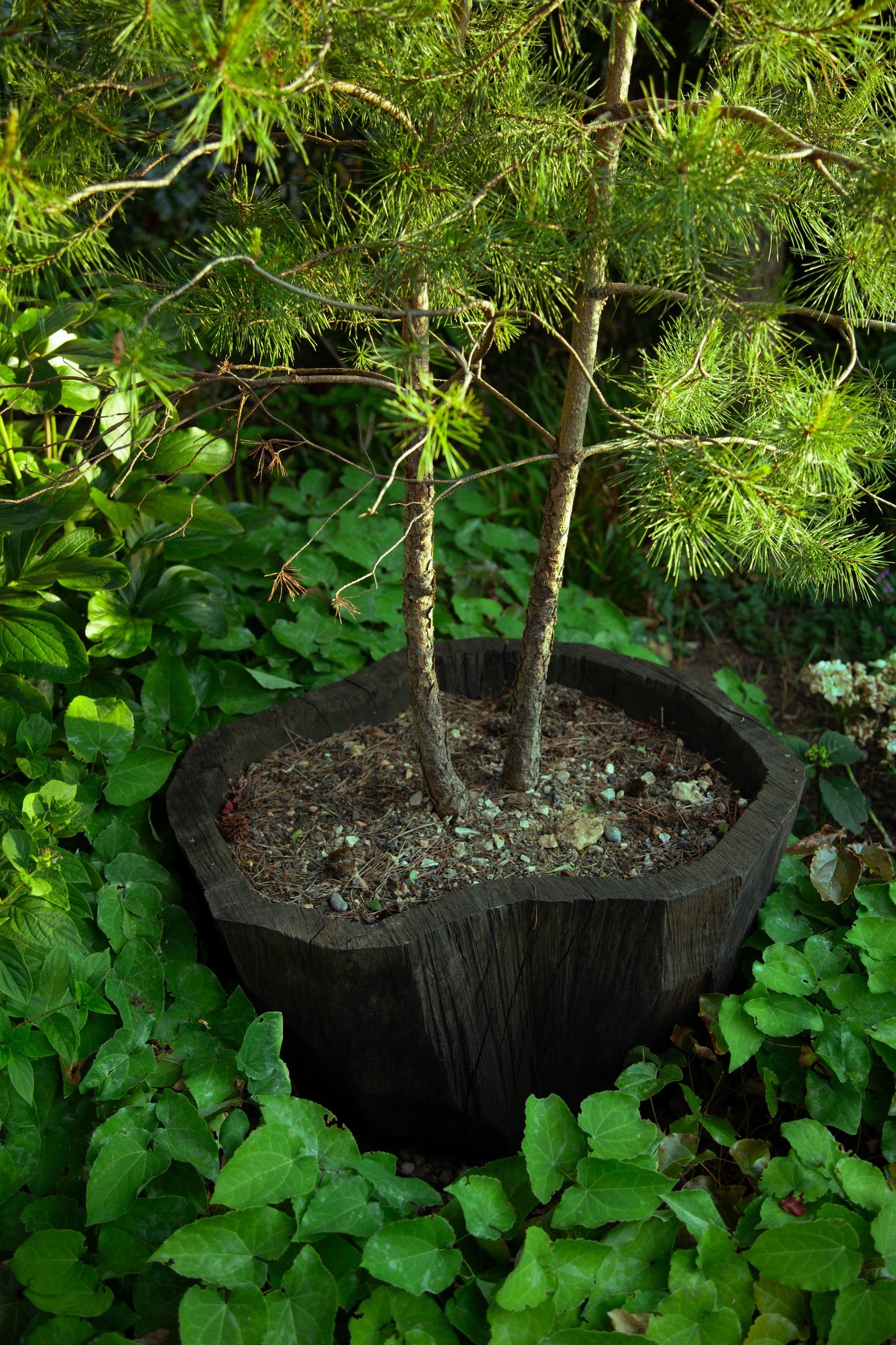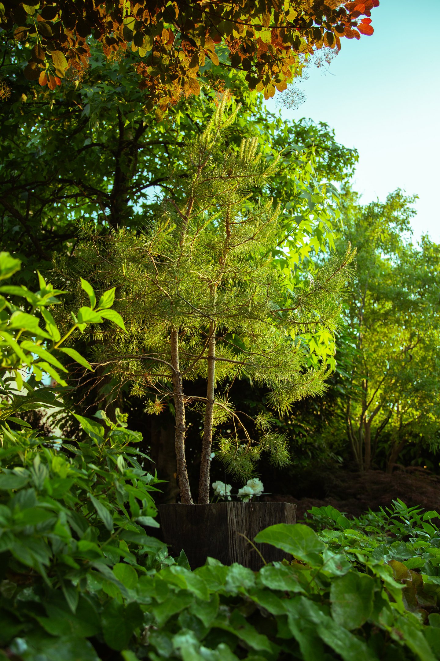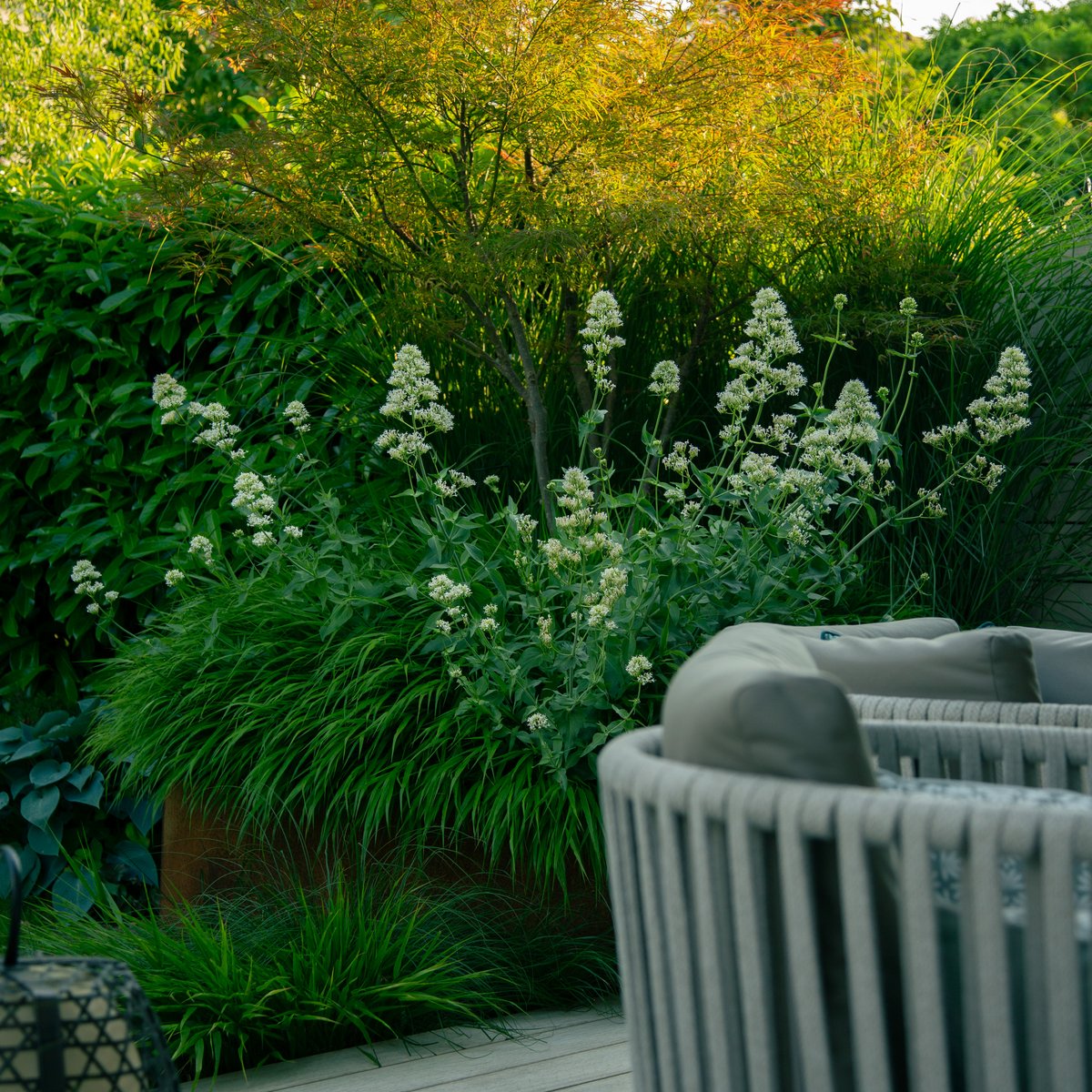 Eichenholz-Gefäße setzen Akzente und bringen organische Elemente in das Gesamtbild ein. Besonderes Augenmerk wurde auf die Gestaltung schattiger Bereiche gelegt: Hier sorgt eine attraktive Auswahl an Pflanzen für eine blühende Oase