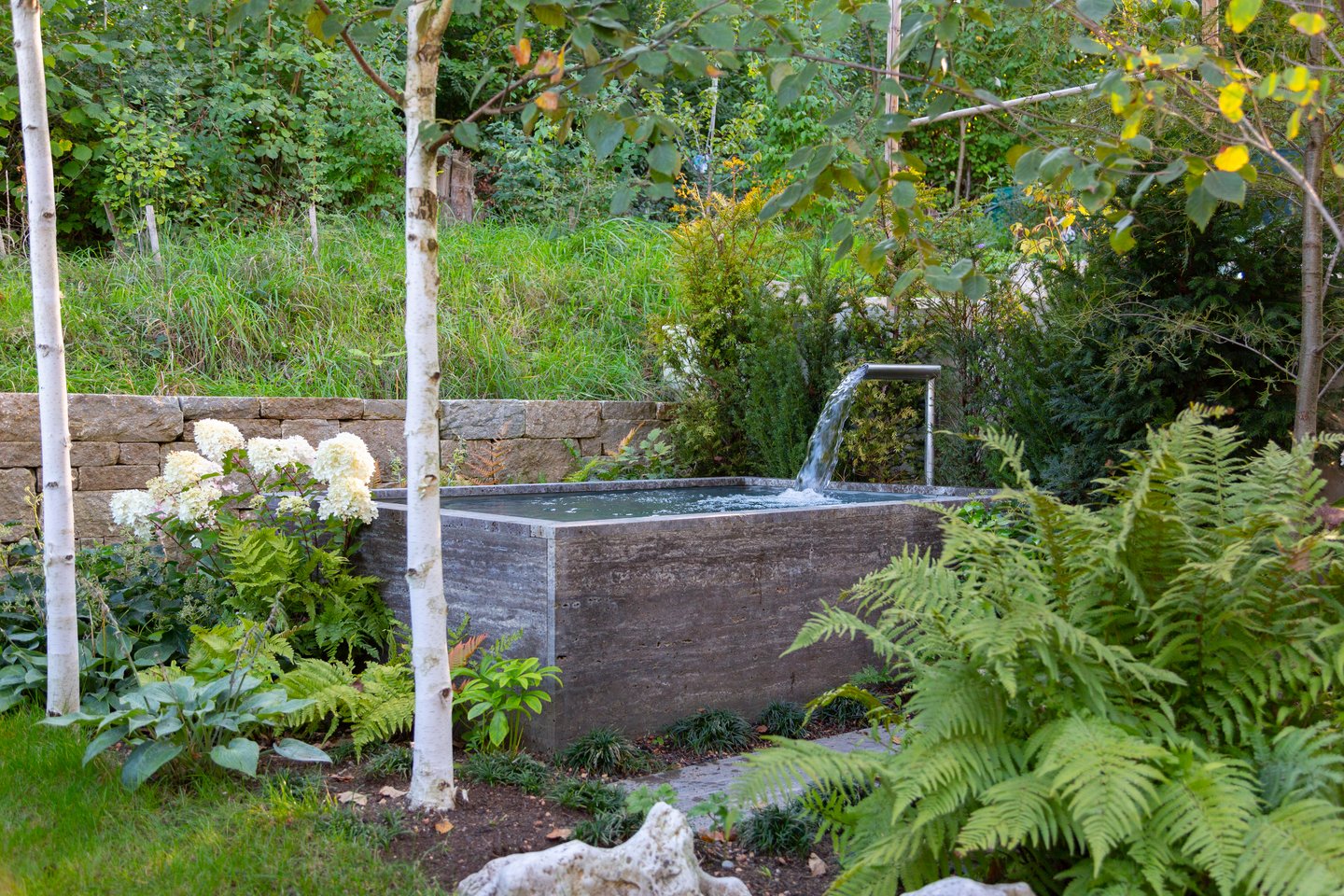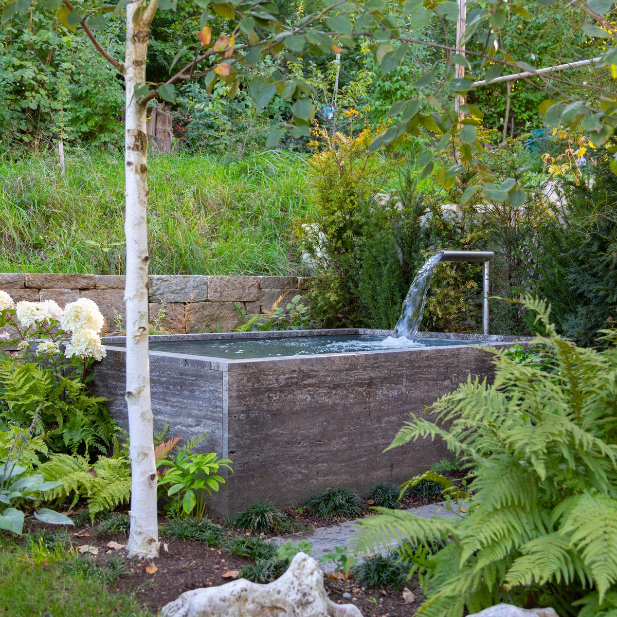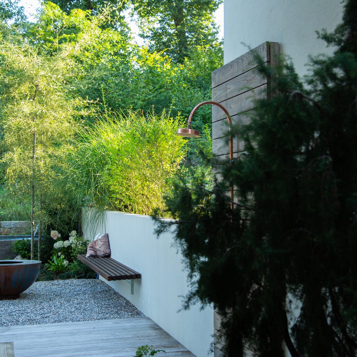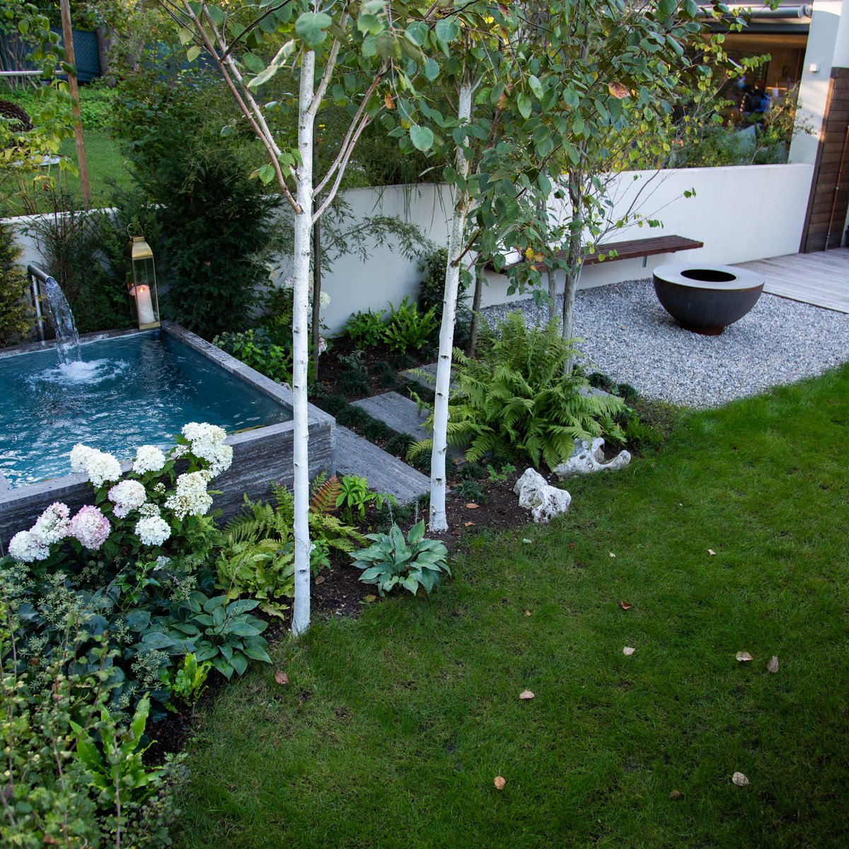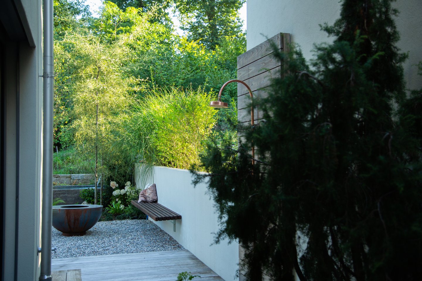 Mit einer geschickten Raumaufteilung und pflanzlichen Raumteilern wurde in diesem kleinen Garten von 90m2 ein neuer Spannungsbogen aufgebaut. Verschiedene Beläge und Pflanzbereiche geben den Räumen eine eigene Bedeutung. Auf diesem kleinen Raum lassen sich versteckte Ecken des Gartens nur erahnen, bevor man sie auf den zweiten Blick genauer entdecken kann. Mit einigen stilvollen Elementen wie Dusche, Brunnen und Feuerstelle wurden wohnliche Akzente gesetzt, die den Garten spannend und einladend wirken lassen.
