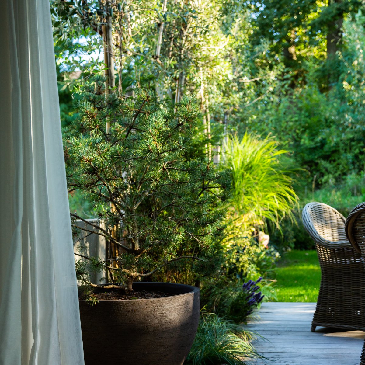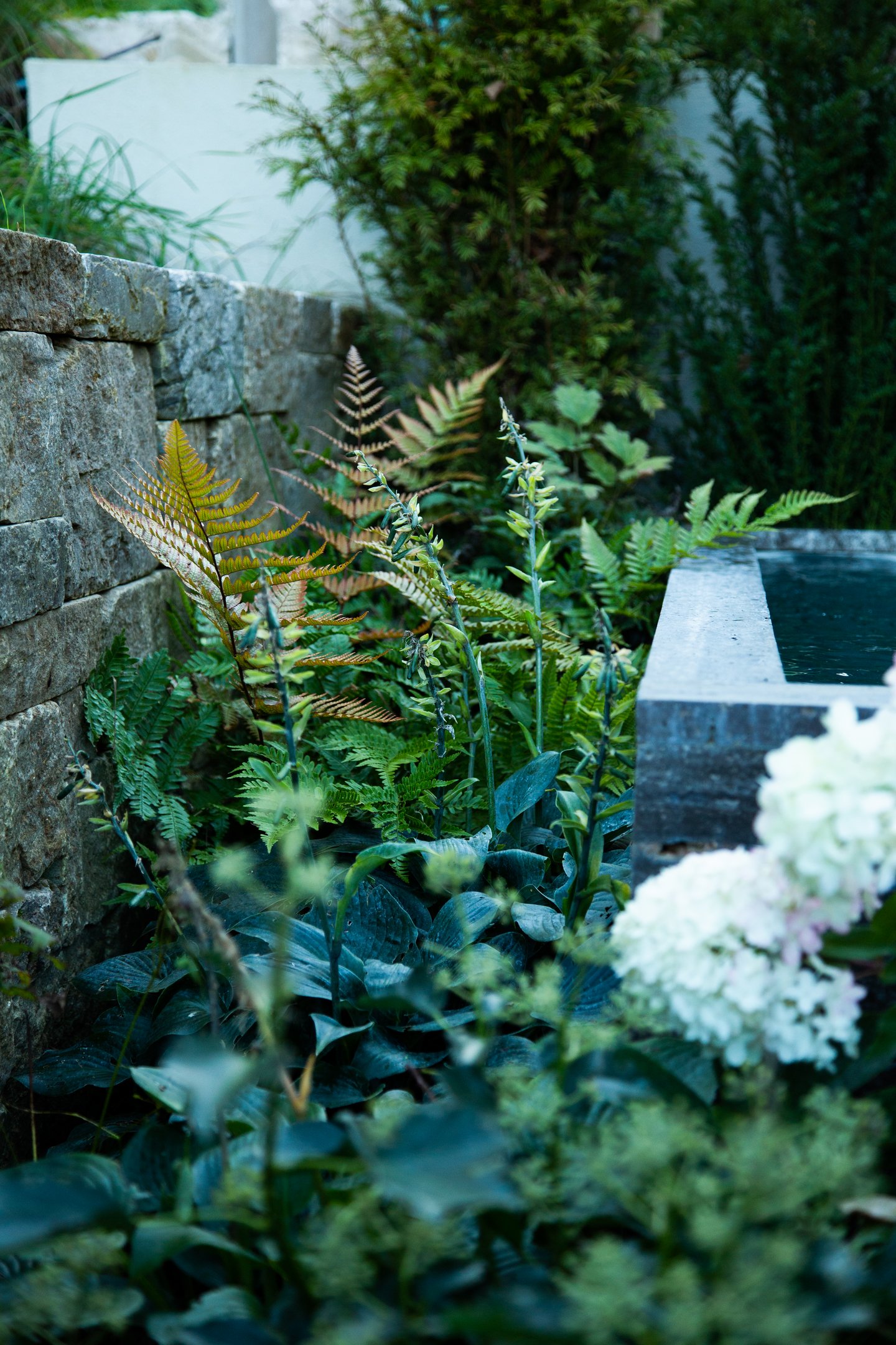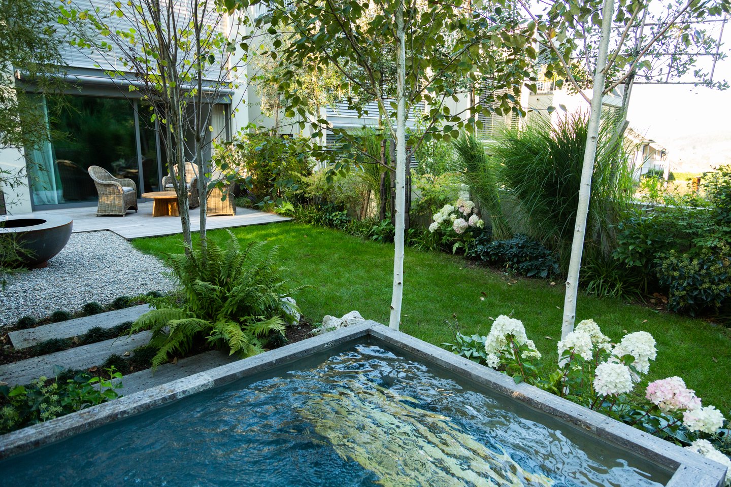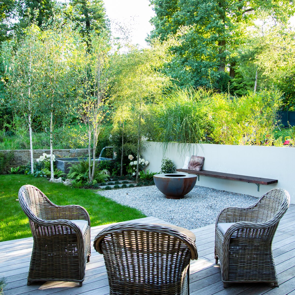 Mit einer geschickten Raumaufteilung und pflanzlichen Raumteilern wurde in diesem kleinen Garten von 90m2 ein neuer Spannungsbogen aufgebaut. Verschiedene Beläge und Pflanzbereiche geben den Räumen eine eigene Bedeutung. Auf diesem kleinen Raum lassen sich versteckte Ecken des Gartens nur erahnen, bevor man sie auf den zweiten Blick genauer entdecken kann. Mit einigen stilvollen Elementen wie Dusche, Brunnen und Feuerstelle wurden wohnliche Akzente gesetzt, die den Garten spannend und einladend wirken lassen.