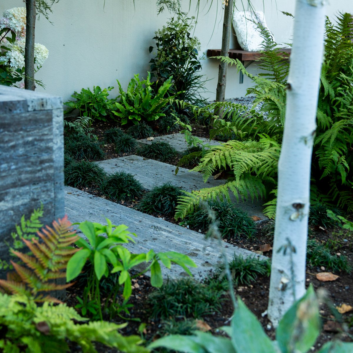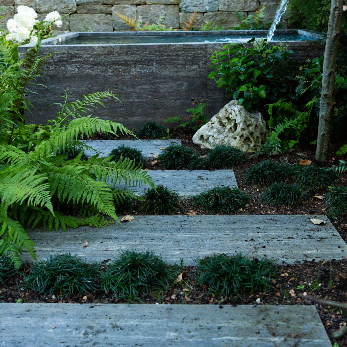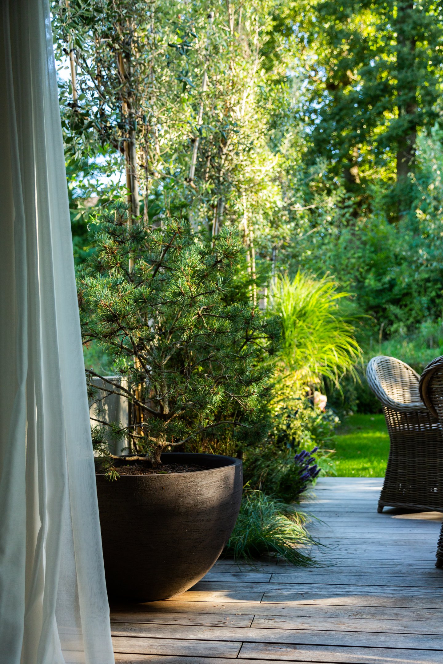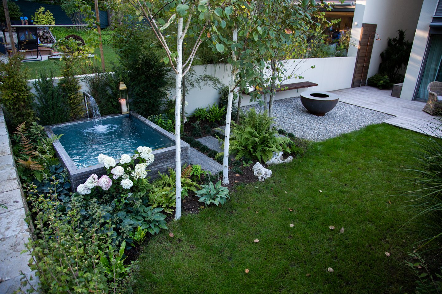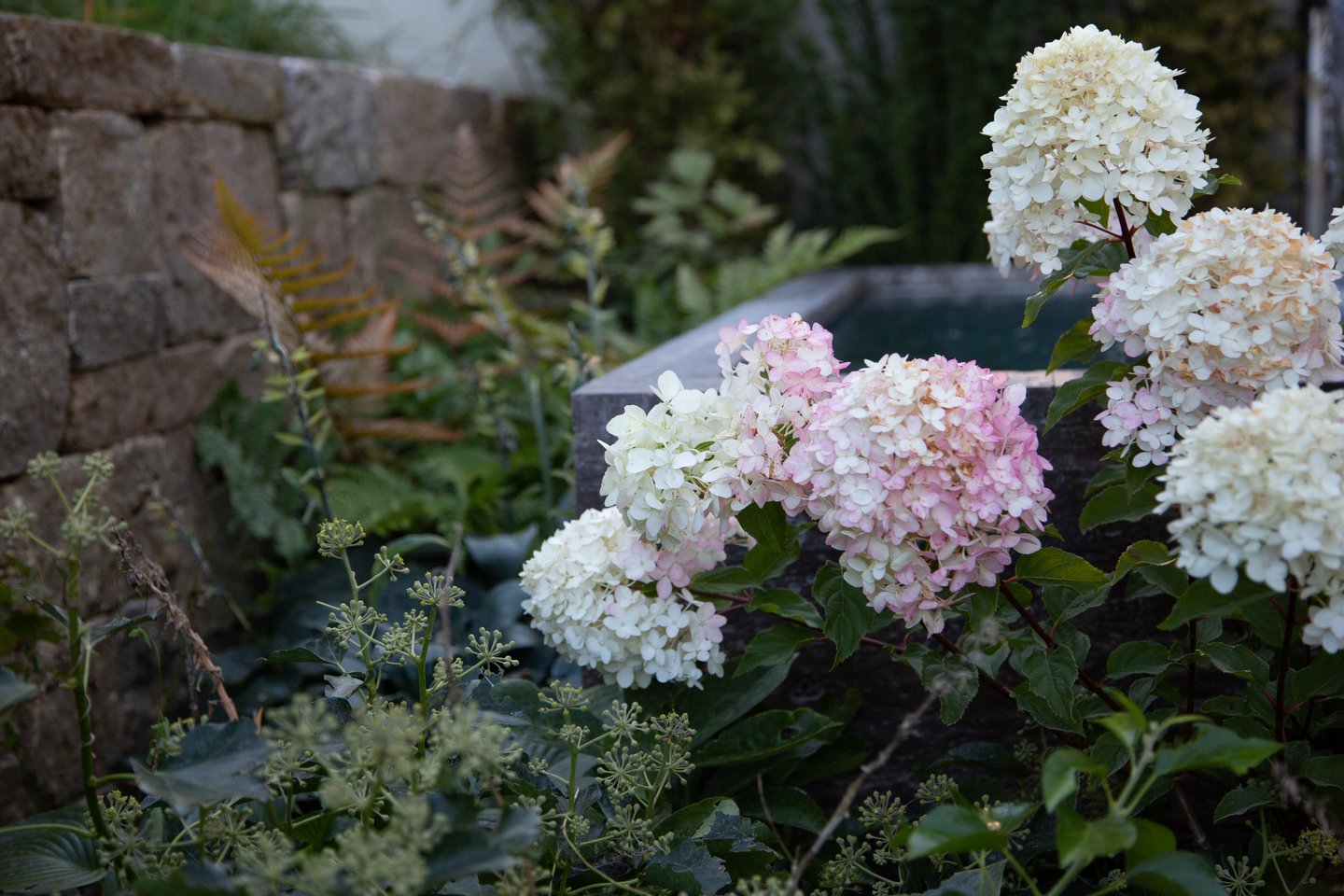 Mit einer geschickten Raumaufteilung und pflanzlichen Raumteilern wurde in diesem kleinen Garten von 90m2 ein neuer Spannungsbogen aufgebaut. Verschiedene Beläge und Pflanzbereiche geben den Räumen eine eigene Bedeutung. Auf diesem kleinen Raum lassen sich versteckte Ecken des Gartens nur erahnen, bevor man sie auf den zweiten Blick genauer entdecken kann. Mit einigen stilvollen Elementen wie Dusche, Brunnen und Feuerstelle wurden wohnliche Akzente gesetzt, die den Garten spannend und einladend wirken lassen.